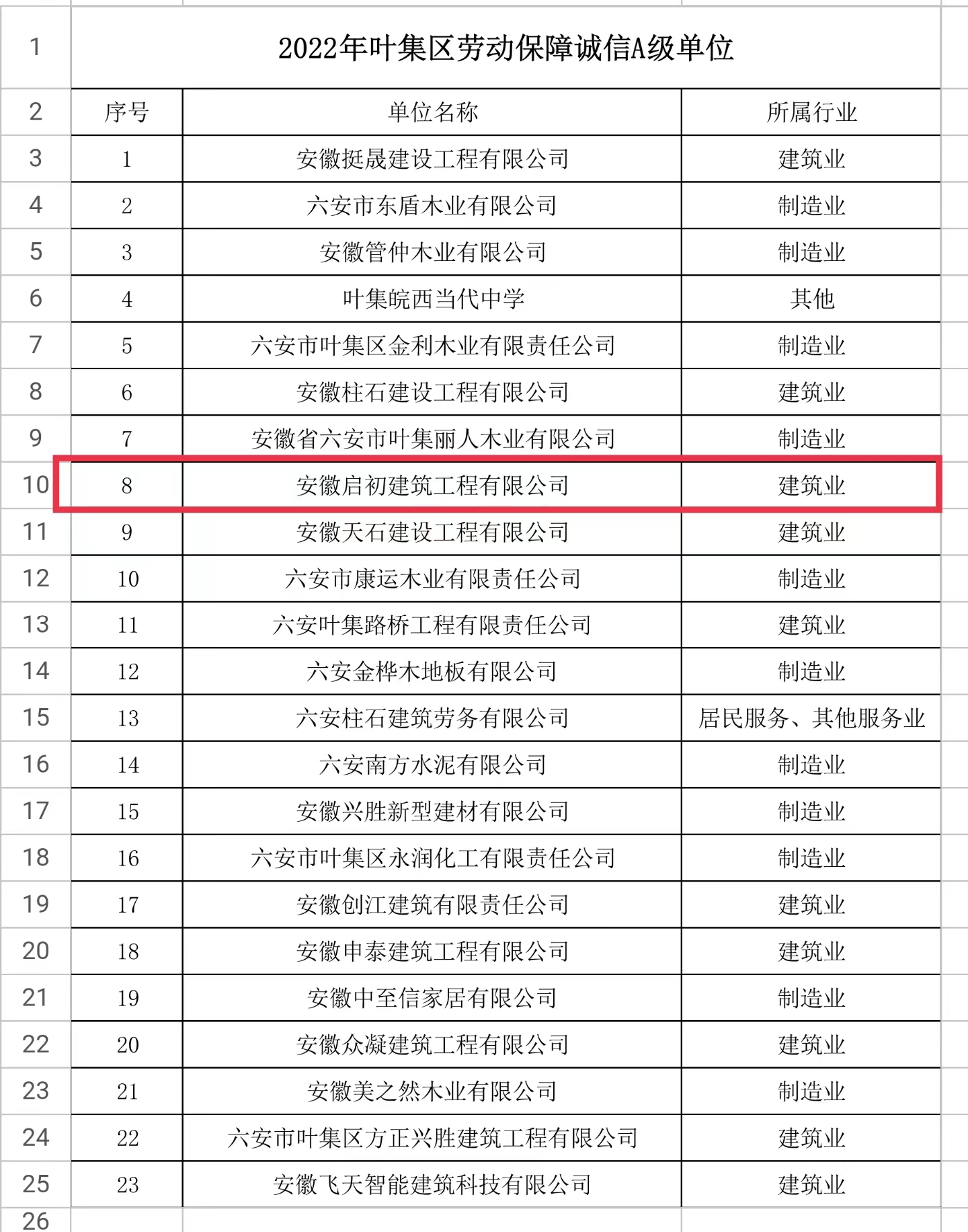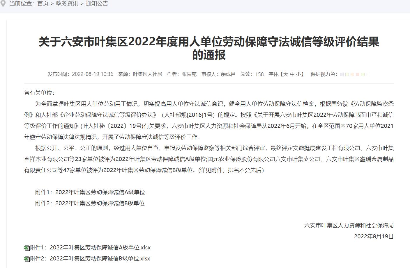 公司榮獲六安市葉集區2022年度用人單位勞動保障守法誠信等級評價A級單位