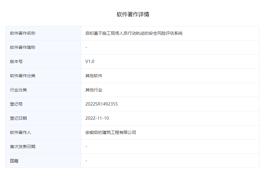 公司獲得軟件著作權-名稱:啟初基于施工現場人員行動軌跡的安全風險評估系統