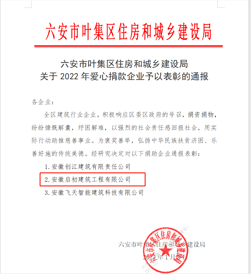 六安市葉集區住房和城鄉建設局關于2022年愛心捐款企業予以表彰的通報